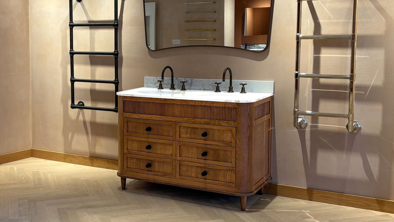 Designed in Toblerone Oak, with Calcatta Tuscany worktop, Orkney Black handles and Lefroy Brooks Classic Taps in London Bronze, this 6-drawer Whittington bathroom cabinet blends a mid-century silhouette with traditional joinery to achieve an organic warmth - perfect for design-conscious homes that value detail, without compromising on function.